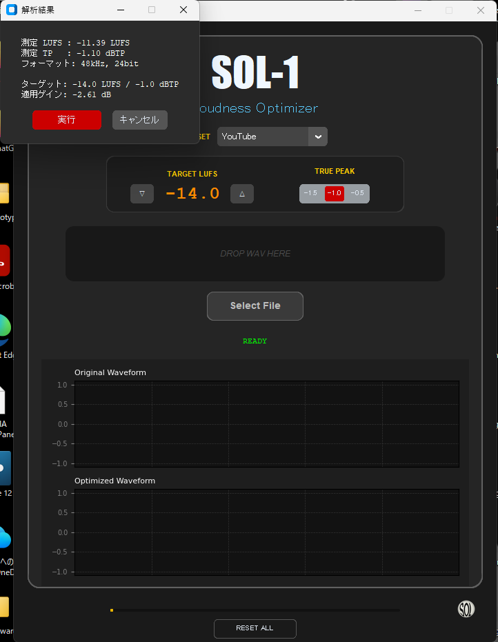 そんなわけで今日は昼前にLINEではなく電話でエンジニアと話をして、音質的な面とか日本語ファイルを読むと出るエラーとかのバグフィクスを終えた。というところで、当初のバージョンの機能に関しては決着が付いたのだが、午後になってふとアイディアが湧いた。それはエンジニアが使っているソフトウェアとかがヒントになったんだけれども、SOL-1の最初の設定ではwavファイルを選択かドラッグ&ドロップすると最適化処理が始まり、最適化されたwavファイルを書き出すという仕様だったが、元々2パス処理で最初に解析をしてから書き出す仕様になっているので、まずはファイルのラウドネスとトゥルーピークの解析結果をポップアップで表示する(現状のLUFS値とTrue Peak値が分かり、どれぐらいの処理をするのかが分かる)→ポップアップ内の「実行」ボタンを押すと最適化したファイルを書き出す処理をする、ということを思いついた。この仕様であればファイルを選択あるいはドロップすればラウドネスとトゥルーピークの解析ができるので、解析・測定ツールとしても使える。これは一石二鳥ではないか、というもの。解析結果によっては別に処理しなくてもいいな、とキャンセルを選ぶことも出来る。