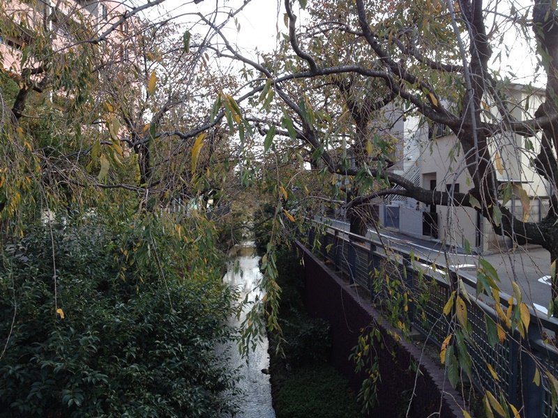歩道橋を渡ったところにある小さな川。春には両側が桜で満開になる。公団住宅の中を抜けたところが住宅街の道だ。アパートのちょうど手前の角にあったひときわ目立つ壮大な豪邸(ヤクザの幹部宅)だったところが更地になって売りに出ていた。